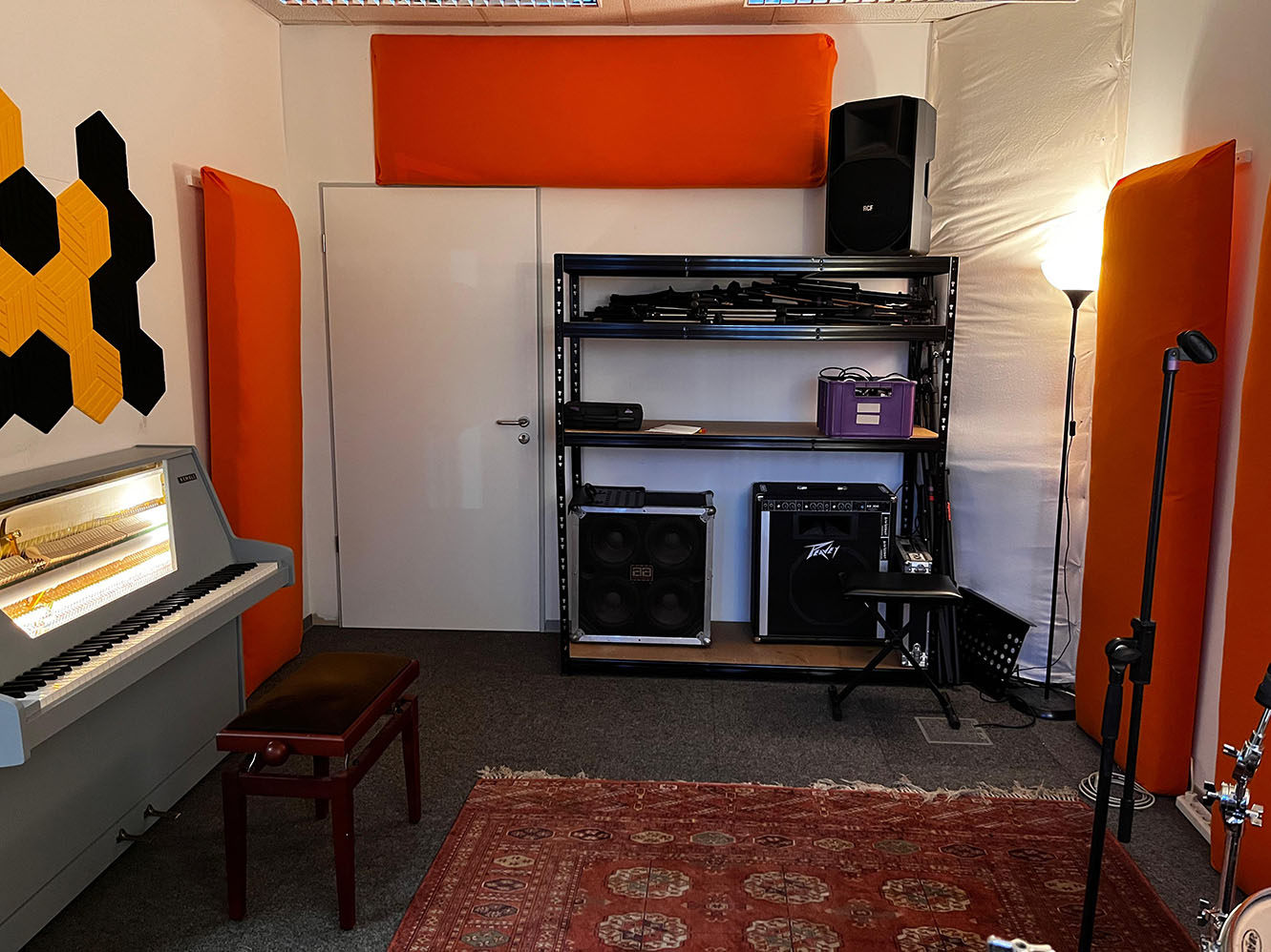 Unser Sessionraum #1 bietet Platz für kleine bis mittelgroße Bands inkl. Drumset, beinhaltet ein aufwändig restauriertes Piano mit optischem Ausbau, ein Equipment-Regal sowie volle Studio/Multicore-Anbindung!