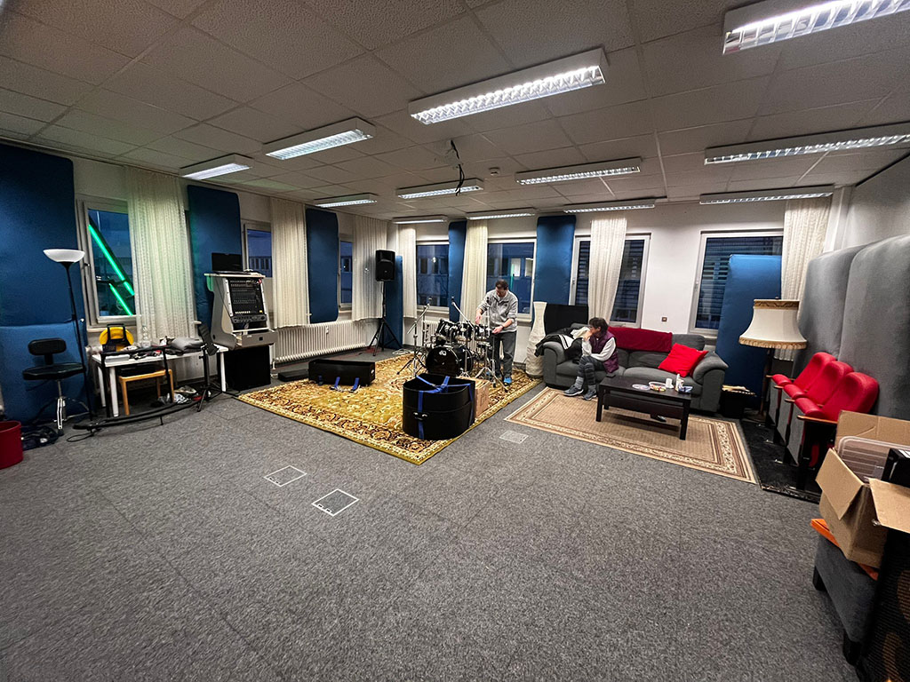 Unser großer Proberaum stellt das Herz der He!Paloma Proberäume dar und bietet sehr viel Platz auch für große Bands und Ensembles, darüber hinaus mehrere Equipment-Lagerregale, eine kleine Lounge mit Couch und Stühlen, das Studio/Multicore-Terminal und viele weitere Annehmlichkeiten.